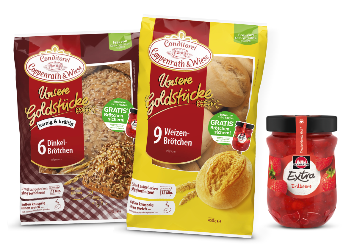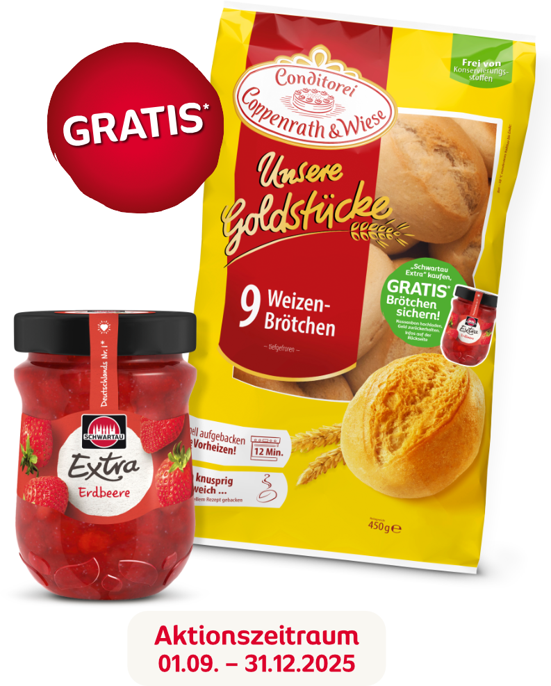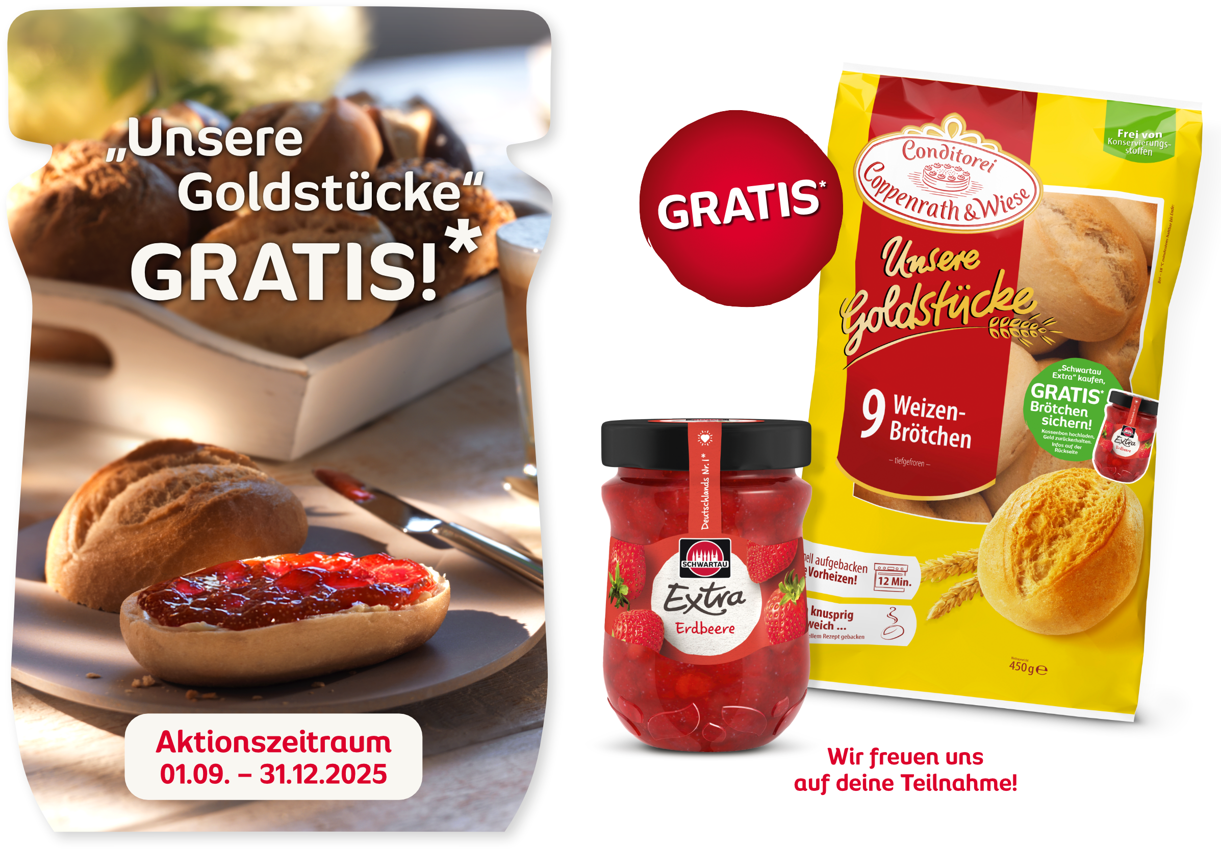 Voraussetzung ist der Kauf eines Schwartau Extra Aktionsproduktes und eines Beutels der Conditorei Coppenrath & Wiese Brötchen „Unsere Goldstücke“. Alle Conditorei Coppenrath & Wiese Brötchen nehmen an der Aktion teil. Über die Aktionswebsite kann eine vollständige Erstattung des Brötchen-Kaufpreises beantragt werden. Nur eine Teilnahme pro Person und Kontoverbindung. Kaufbeleg nur einmalig einlösbar. Aktionsveranstalter sind die Conditorei Coppenrath & Wiese KG, Hansastraße 10, 49497 Mettingen und die Schwartauer Werke GmbH & Co. KG, Lübecker Straße 49-55, 23611 Bad Schwartau. Weitere Informationen, Teilnahmebedingungen und Datenschutzhinweise unter der Aktionswebseite: www.schwartau-goldstuecke.de