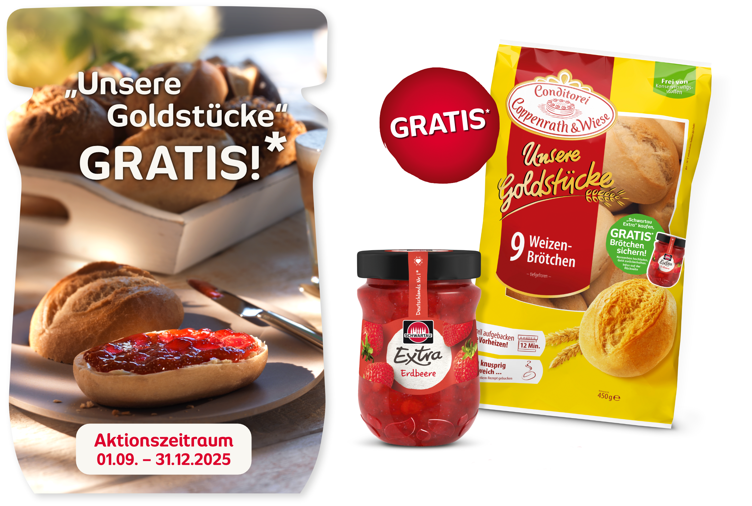 SCHWARTAUER WERKE GmbH & Co. KG, Lübecker Straße 49-55, 23611 Bad Schwartau (im Weiteren: „SCHWARTAU") und der Conditorei Coppenrath & Wiese KG, Hansastraße 10, 49497 Mettingen (im Weiteren: „COPPENRATH & WIESE“) führen im Zeitraum vom 01.09. bis zum 31.12.2025 (im Weiteren: „Teilnahmezeitraum“) eine „GRATIS BRÖTCHEN AKTION“ durch.